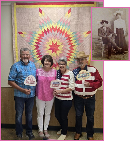 In this photo, Lynda and I are with my brother Danny and his wife Anita. My grandmother made this quilt. It is probably 100 years old. The hat belonged to my grandfather. The offset photo is their wedding picture.